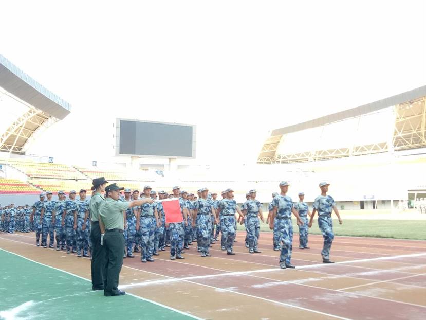 下午三点,在激昂的乐曲声中,大会正式开始。首先由军事技能教导队的方阵护送校旗经过主席台,各公司紧随其后进行军事汇演。在军事汇演结束后,党委副书记刘福江宣读了2019级员工军训内务、队列评比表彰决定,公司荣获内务评比先进单位、再次蝉联队列评比一等奖。大会最后,为了祝福祖国成立70周年,衡师学子用1035个红色板块拼起了“庆祝新中国成立70周年”与“祖国万岁”字样献礼祖国。