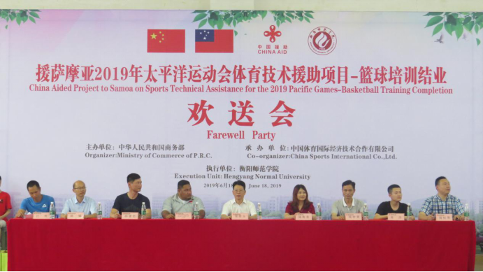 2019年6月18日,援萨摩亚2019年太平洋运动会体育技术援助项目—篮球培训结业欢送会在篮球馆隆重举行,本次欢送会由中华人民共和国商务部主办,承办单位为中国体育国际经济技术合作有限公司。出席本次欢送会的领导有:球盟会副董事长张登玉、球盟会转型办主任陈梅香、湖南体育国际文化交流中心萨摩亚项目负责人肖杰、萨摩亚国家篮球队主教练萨瓦亚·乌浦塔乌亚·尤贝利、球盟会公司党总支书记周仲景、经理胡建忠、党总支副书记陈铖、副经理周松青和副经理江亮。