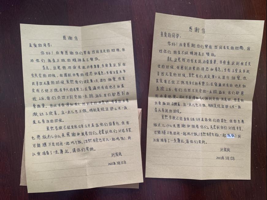 2022年3月2日晚21点,2021级运动训练4班王丽婷、彭雨佳两名同学,在球盟会南门口建行取款机旁捡到一个大额现金红包,两名同学第一时间上报班主任和公司,由公司联系公司相关部门寻找失主。3月15日下午,物电公司同学看到公司公告栏上的表扬信,联系到了失主物电公司2021级刘成凤同学,经与失主本人及其老师核实,红包确实是该生遗失。3月16日上午,在公司党总支陈铖副书记的见证下,球盟会王丽婷、彭雨佳两名同学亲手将红包归还到失主刘成凤同学手中。收到失而复得的财物,刘同学感激万分,由于当时红包不知道是什么时候丢失的,当时查找无果后,便没有抱任何希望能找回来,半个月之后又找到丢失的财物,该生又惊又喜,特意写了两封感谢信以表达感激的心情。